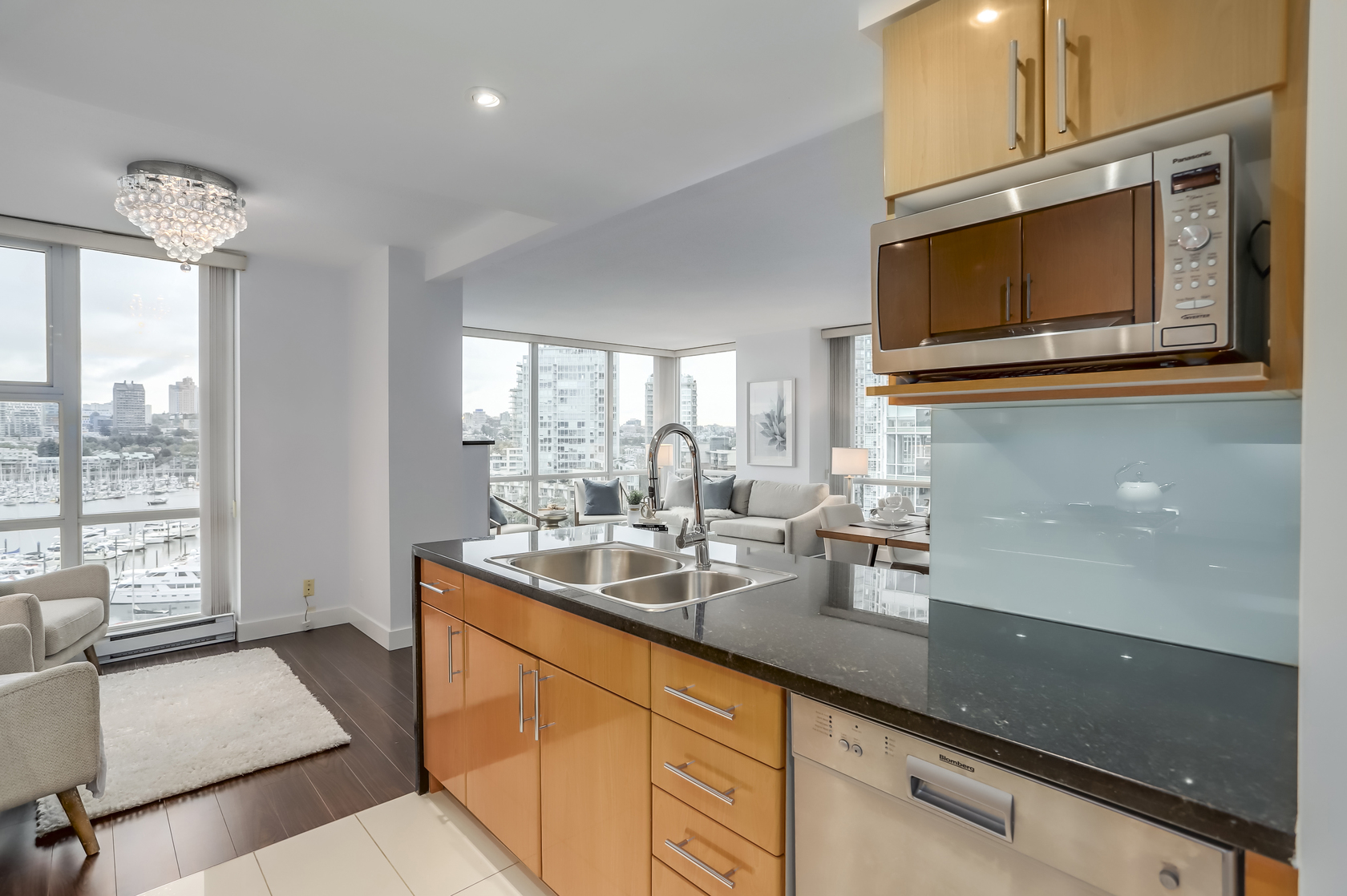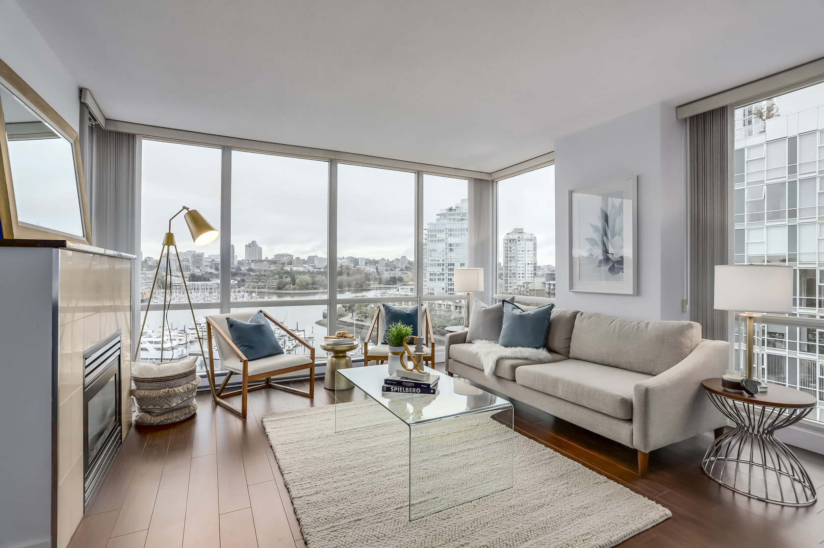 Breathtaking False Creek and Marina views from every room of this rare 03 front unit at this renovated 'Marinaside Resort' unit.