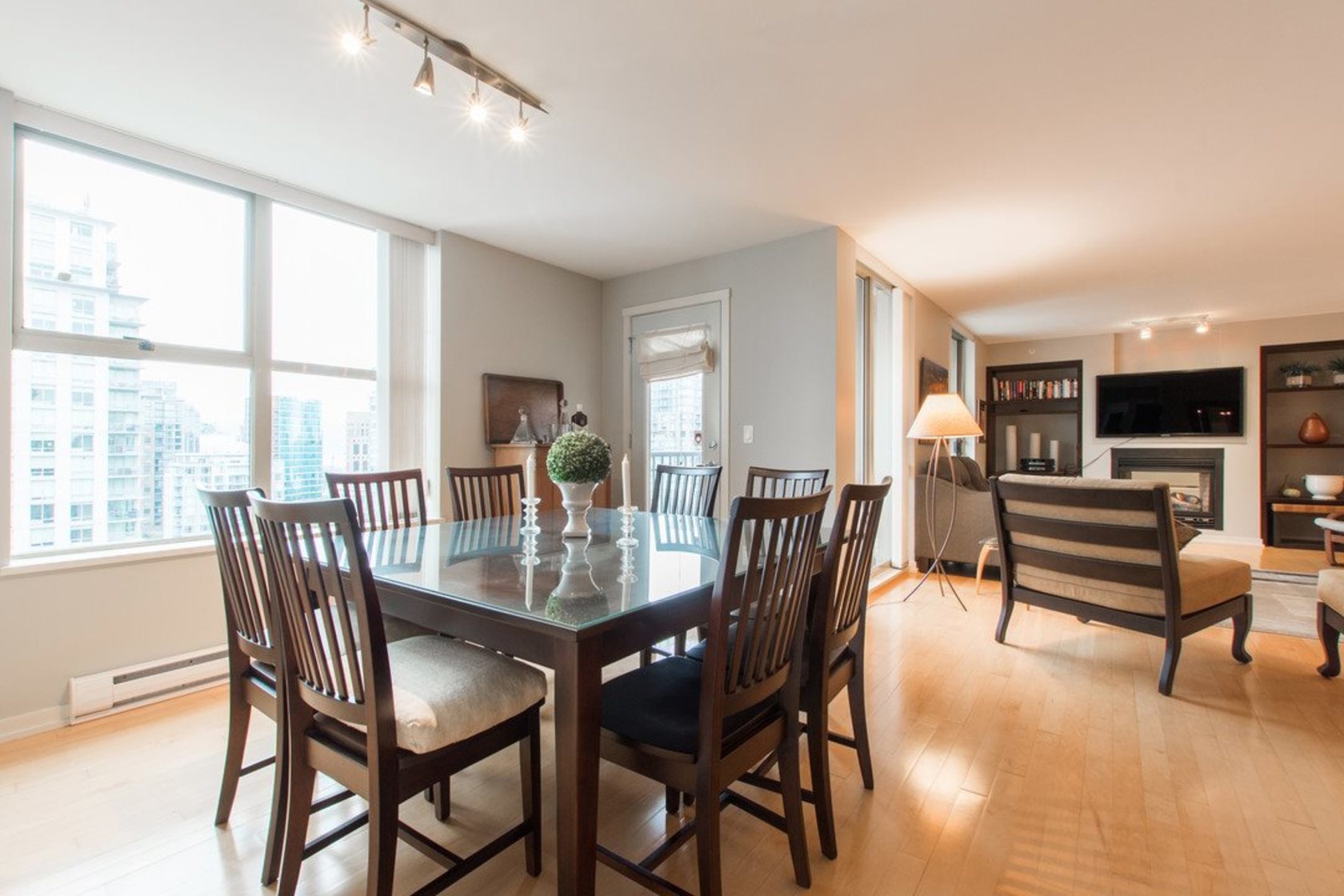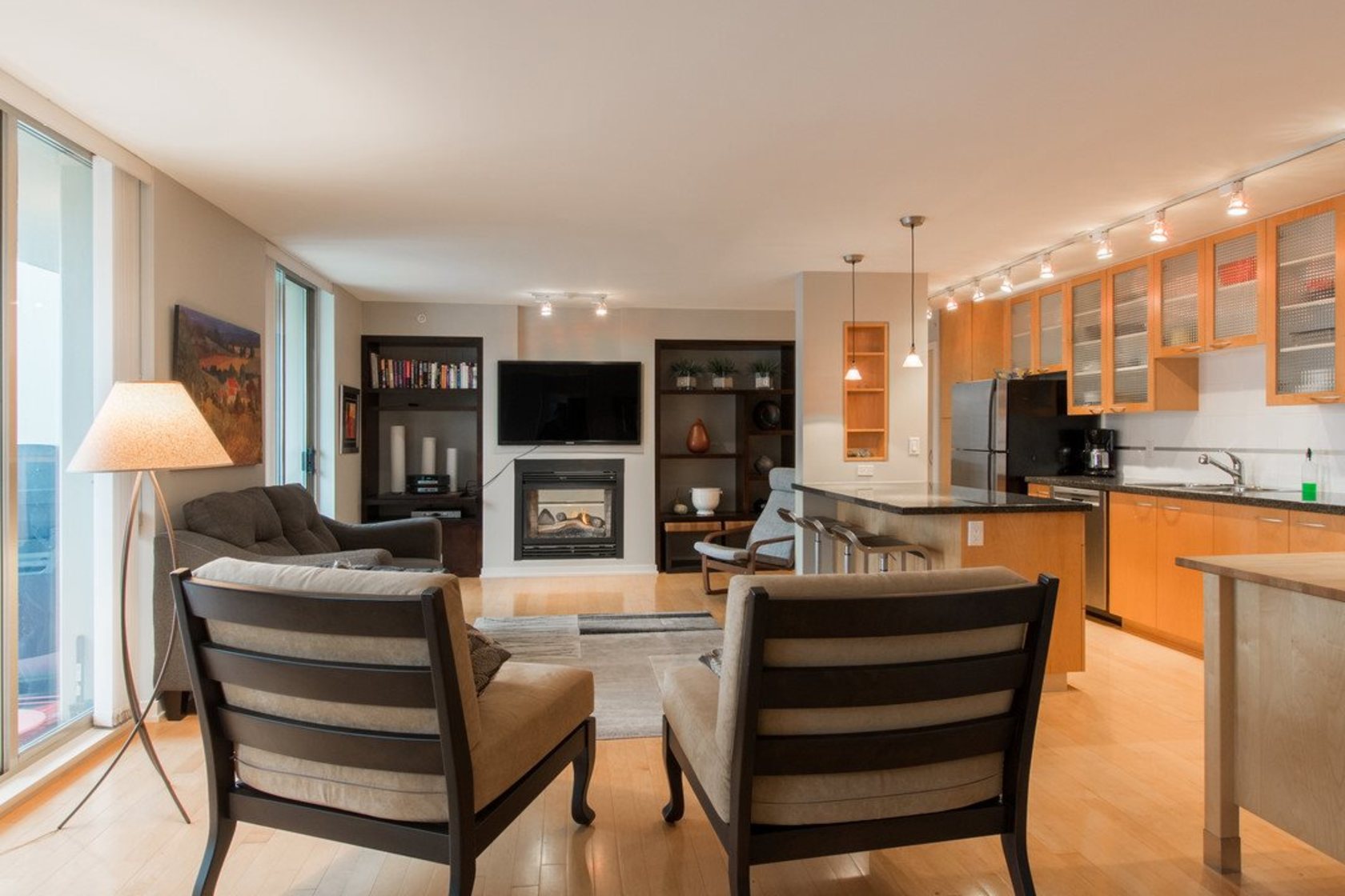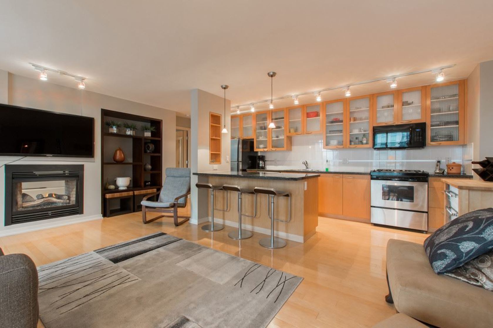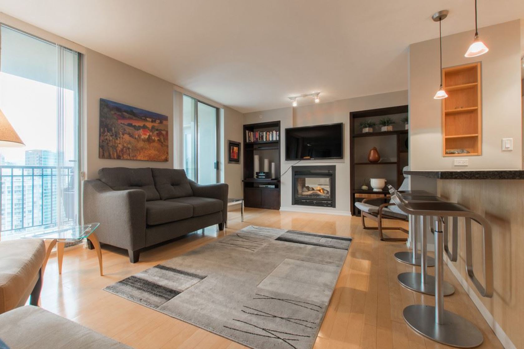 Upper NW corner suite provides city views & privacy with only 4 units on floor. Open concept spacious living-dining-kitchen makes entertaining easy and comfortable. Gourmet kitchen has s/s appliances, granite counters & generous cabinet space. H/W floors throughout & gas fireplace between living room & master BR (which has large walk-in closet & full ensuite). Murphy bed in 2nd bedroom. Sizeable balcony with gas connection for BBQ. Immaculate condition, se…ller is original owner. Highly sought after, Bosa-built Mondrian 2 is located in heart of downtown, steps from terrific restaurants, shopping, grocery stores, parks & entertainment. A must-see for those seeking 1-level living with condo convenience. Open Sat 2-4pm, Sun 12-2