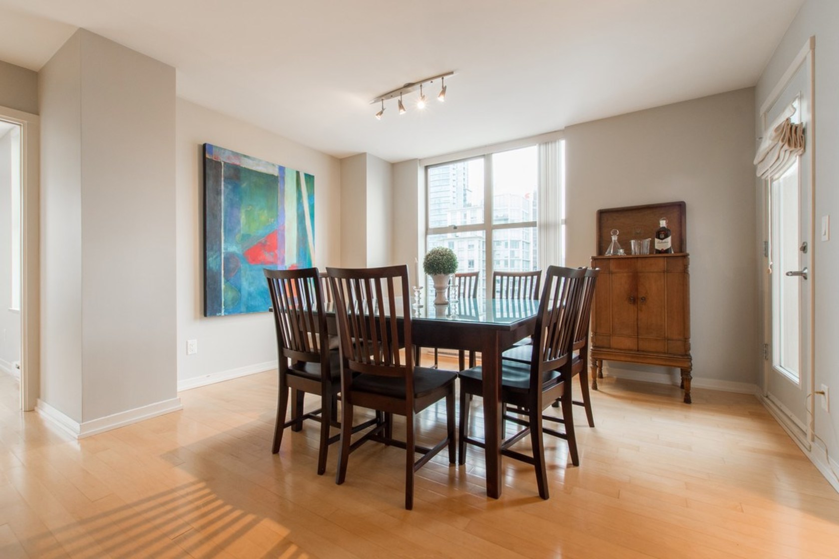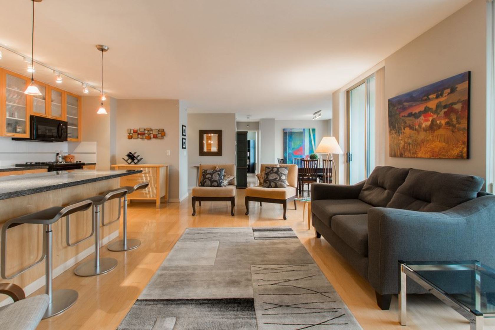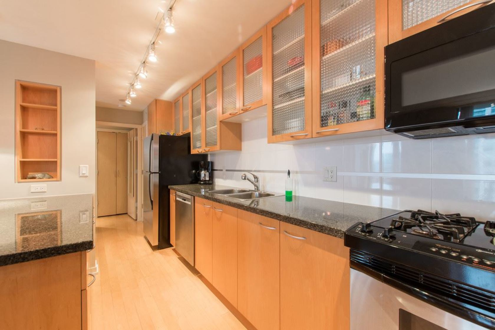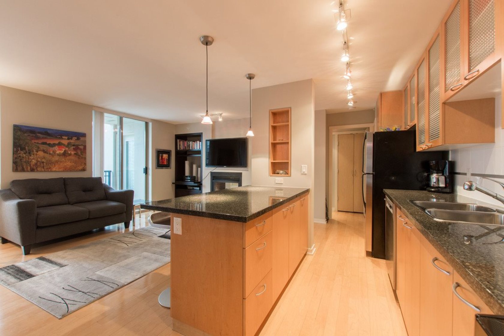Upper NW corner suite provides city views & privacy with only 4 units on floor. Open concept spacious living-dining-kitchen makes entertaining easy and comfortable. Gourmet kitchen has s/s appliances, granite counters & generous cabinet space. H/W floors throughout & gas fireplace between living room & master BR (which has large walk-in closet & full ensuite). Murphy bed in 2nd bedroom. Sizeable balcony with gas connection for BBQ. Immaculate condition, se…ller is original owner. Highly sought after, Bosa-built Mondrian 2 is located in heart of downtown, steps from terrific restaurants, shopping, grocery stores, parks & entertainment. A must-see for those seeking 1-level living with condo convenience. Open Sat 2-4pm, Sun 12-2