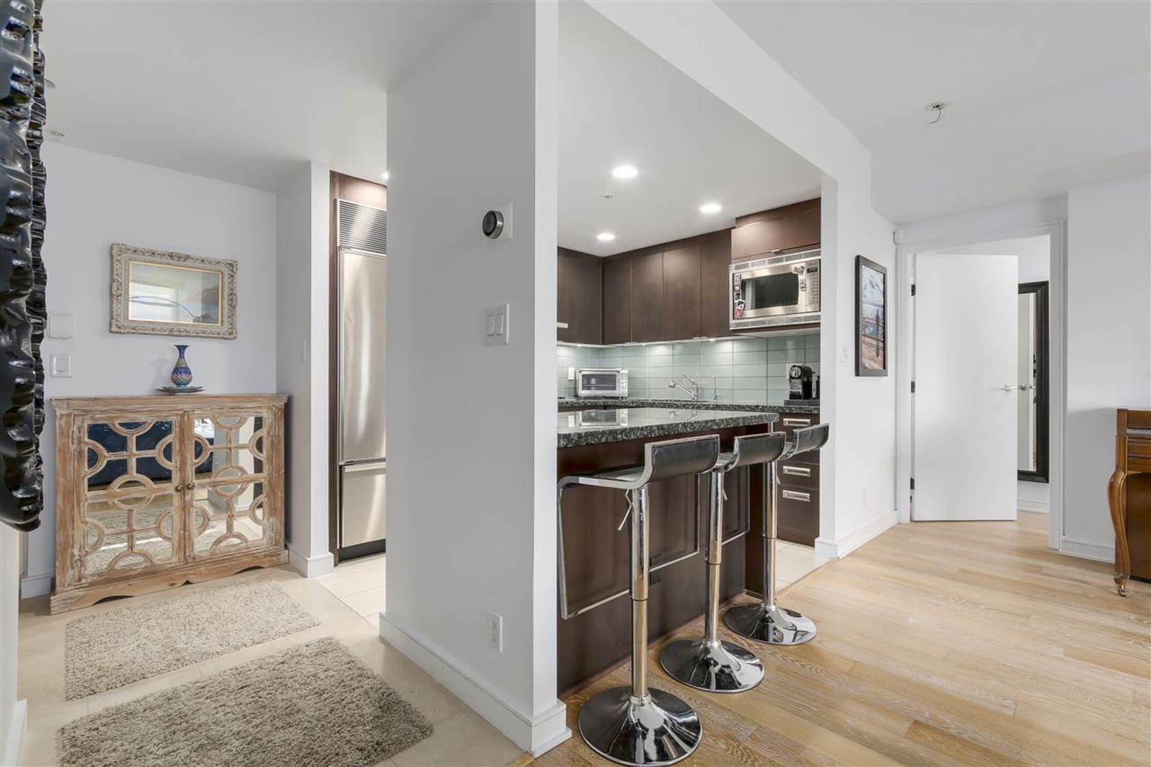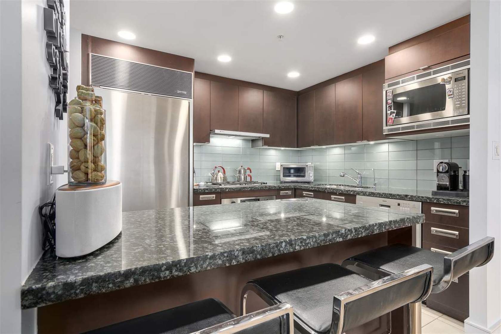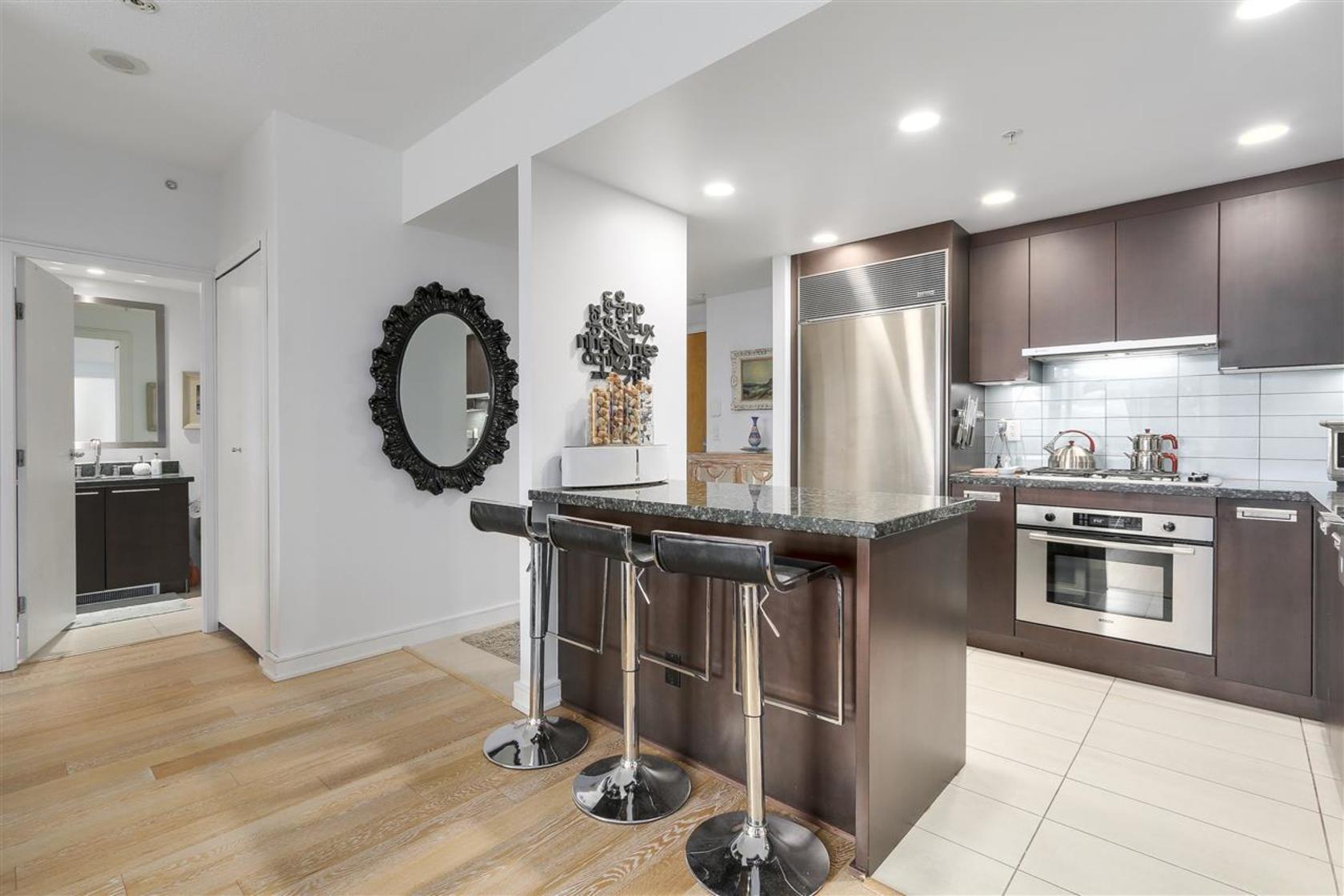 Exceptional two-bedroom suite in the exclusive and tree-lined Bayshore Gardens with lovely winter views to north shore mountains, marina, Coal Harbour and Bayshore Hotel. This beautiful residence offers functional floor plan with spacious living and dining area, large master bedroom with dedicated work/study area, fabulous kitchen with Bosch and Sub-zero appliances as well as a wine fridge! Gorgeous laminate wood flooring throughout and, air-conditioned and an over 200 sq.ft.… patio balcony perfect for summer barbecuing. Ammenities include concierge and an exercise centre on same floor. Just steps to Stanley Park, seawall, shops/restaurants and all other conveniences. Agent's open Friday March 31 10-12 PM, Public Open Saturday & Sunday April 1st & 2nd, 2-4PM